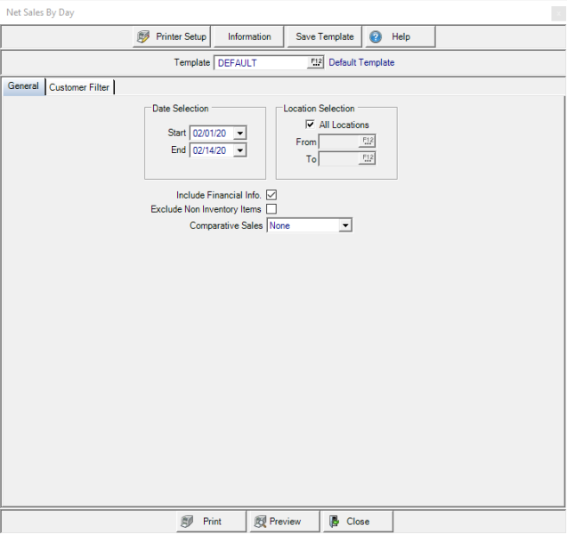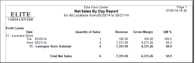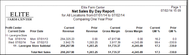 Compare the Net Sales by Day against one or two years prior for the same dates. Revenue, Margin and gross margin percentages will be compared. Customize this report by selecting a specific location or excluded Non Inventory Items and sales of Gift Certificates.