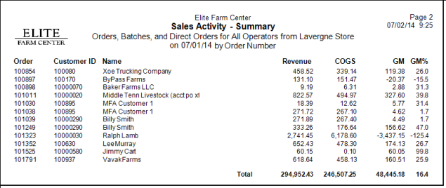 Use this report to view summary Revenue, Cost of Goods Sold and Gross Margin information for a specific date or date range. Order Number and Customer names are included.