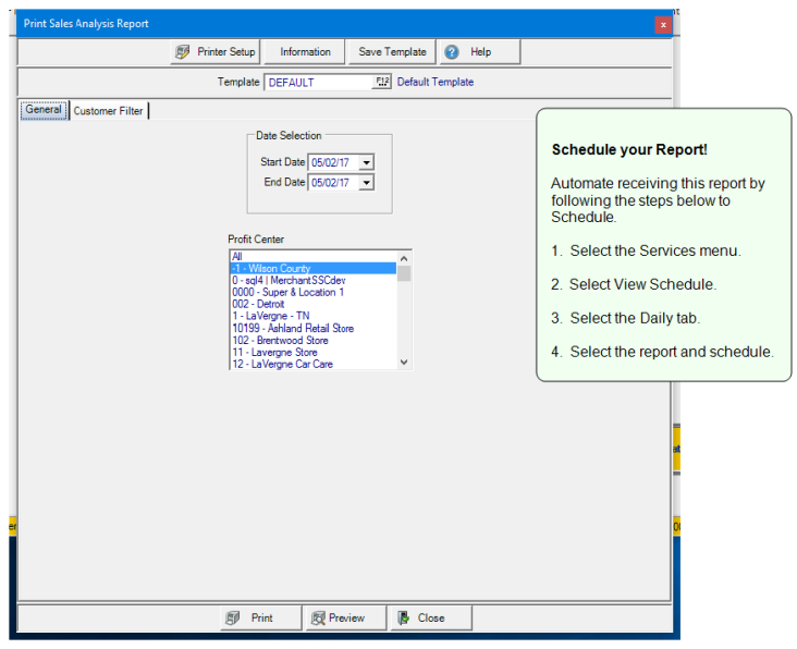 Profit Center defaults to all Locations which will be used for any scheduled report. Select one or multiple Locations and or select F12 to search.