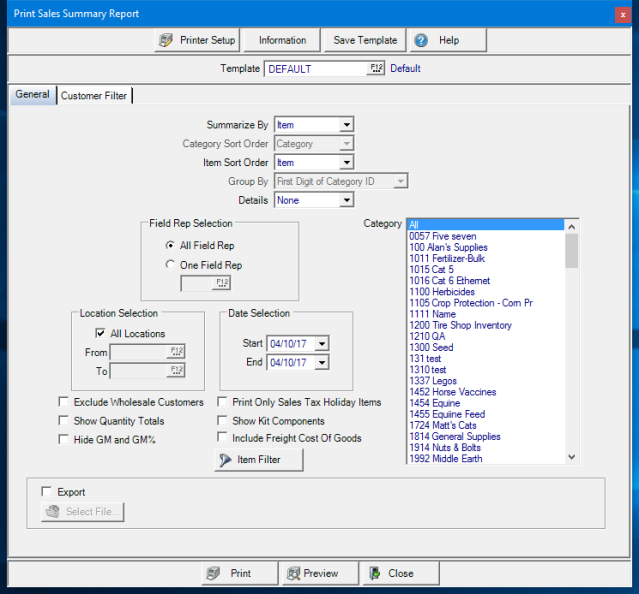 Create a Sales Summary report to summarize Item sales by a specific day or date range. Customize the report by selecting Locations, Management Regions or Field Reps. Identify items included on Sales Tax Holidays and generate a report to track sales of those Items.