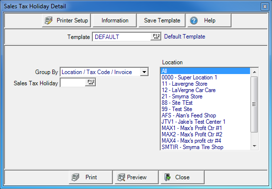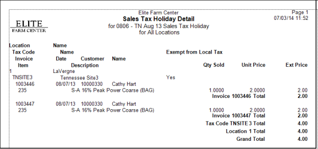 Create a Tax Holiday Detail report to total all invoices for Items included in a sales tax holiday. During this time the selected items are exempt from Sales Tax. See Access Tax Holidays for more information.