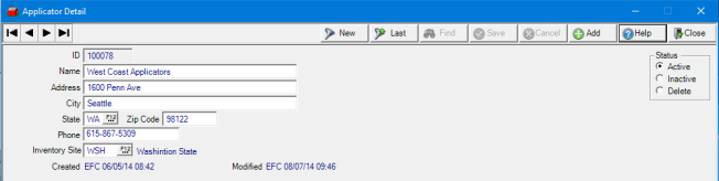 Create and maintain Applicators who provide restricted chemical application services to customers who do not have current Chemical Licenses attached to their account. Select Find to view existing Applicators. Look for which indicates a required field. Select Access Customer > Applicators to review Applicators associated with an account.