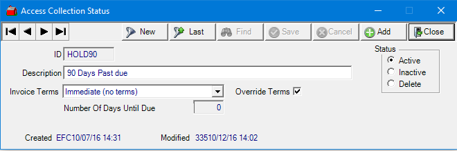 Select the Invoice Terms associated with the Collection Status which are applied to the Customer account when selected. When a Collection Status is applied to Access Customers > Credit, the terms set for the Collection Status replaces any Terms set on the account.