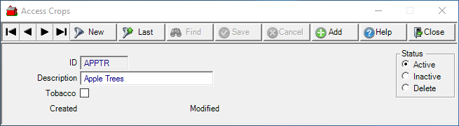 Use Createdand Modified to view the Username, Date and Time the Crop Use was created or edited.