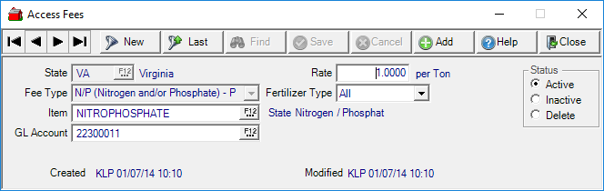 Create or review all applicable Fees for Tonnage Tax, Lime, Nitrogen and or Phosphate, and Environmental by State using Access Fees. Navigate to Setup > Access Locations > Profit Center and select the Environmental Fee and/or Nitrogen/Phosphate fee to asses these fees on all fertilizer batches.