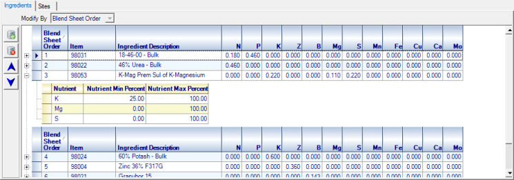 As Ingredients are added to the Blend sheet, set a minimum and maximum of nutrients to be used from each ingredient for the Blend. Expand the ingredient and enter a percentage in either or both columns. For instance, in the example below, the batch using this Blend would receive 25% of it's potassium from K-Mag and the remaining 75% from other sources.