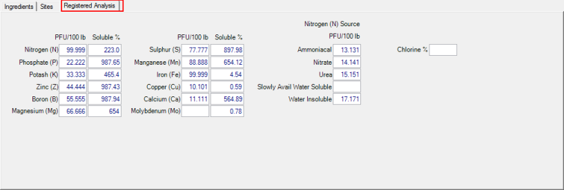 Default Analysis (PFU/100lbs)-The nutrient analysis of the blend in plant food units per 100 lbs.