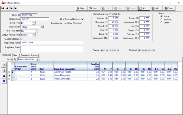Create Fertilizer Blends to streamline adding ingredients to Fertilizer batches. Set defaults for the Blend such as availability for Least Cost Blending, allowing excess nutrients and if this is a Registered Blend. Use Find to determine if the Fertilizer blend is available.