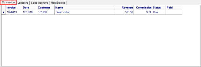 Commission lists all invoices the Individual has earned commission on and indicates if it is due or has been paid. These invoices are for items that have been marked for Commission and sold to Customers the Individual is listed as the Field Rep. See Item Detail and Customer Detail > Info > Field Reps for additional information.