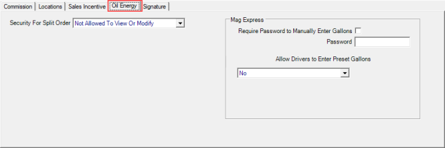 For Locations using the Oil & Energy module, in the MAg Express section select the Require Password to Manually Enter Gallons checkbox and enter a Password of up to 20 characters if needed. These fields are active if Driver is selected above.