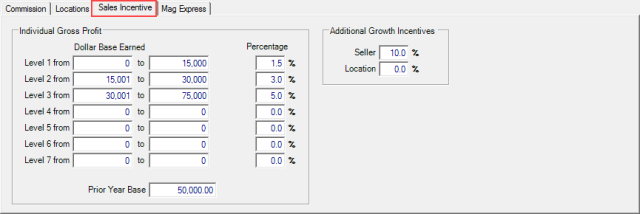 Enter the Prior Year Base which is the minimum Gross Profit a Field Rep must satisfy prior to earning any Sales Incentive. Remember to update this figure yearly, it does not populate automatically.
