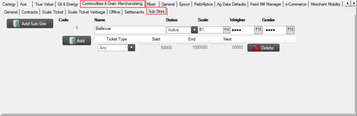 At some Locations, grain is received and stored on a seasonal basis for a short period of time each year. These are considered satellite locations, or Sub-Sites of a nearby main location and do not need a separate Site created. For the grain transactions at these sub-sites, manually entered pre-numbered scale tickets are used to account for the grain receipts and shipments.