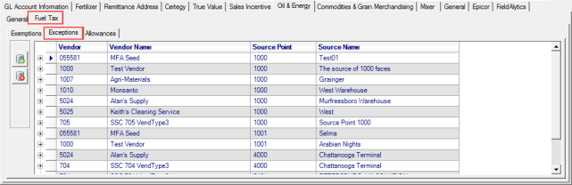 Use the Exceptions tab to add the Energy Commodity Source Points by Vendors associated with the Location. Multiple Fuel Taxes for each Source Point can be entered and is optional.