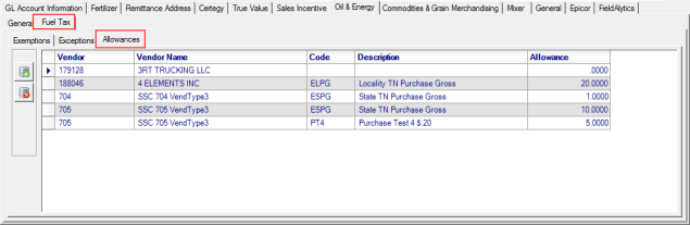 Oil & Energy users can maintain fuel tax allowances by vendor and site to verify correctly charged fuel taxes on PO receipts. Fuel tax allowances are entered on the Location with a vendor, fuel tax, and the rate of the allowance and apply to Purchasing type Fuel Tax Codes. When a fuel Purchase Order is received, the allowances will be automatically deducted from the fuel tax accrued.