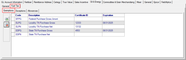 The Fuel Tax Exemptions tab lists all Fuel Tax the location will be exempt.