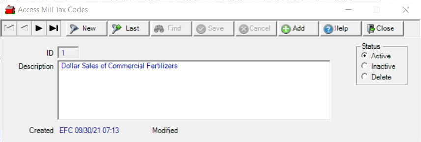 Create a new Mill Tax Code, by clicking Add and enter up to two digits for a numeric ID.