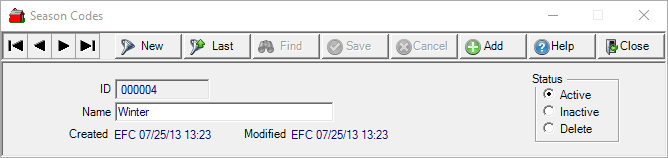 Group Items by a Season code to define when Items can be ordered. Select Find to review or select existing Season Codes. Add to an Item by navigating to Item detail > Misc > Other > Season Code.