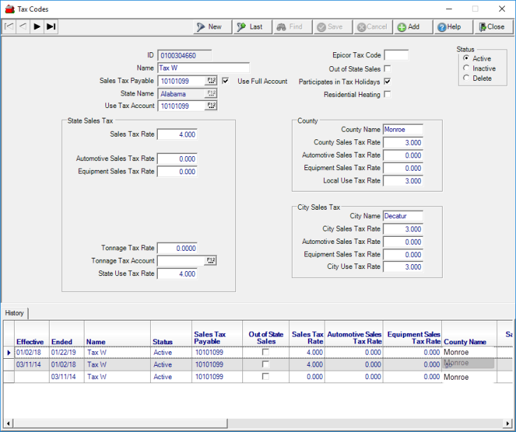 Edit and create State Sales tax codes using Access Tax Codes. Select a State and the sections for type of tax assessed will automatically populate. Tax rates can be edited and added as needed. Search for an existing Tax Code using Find.