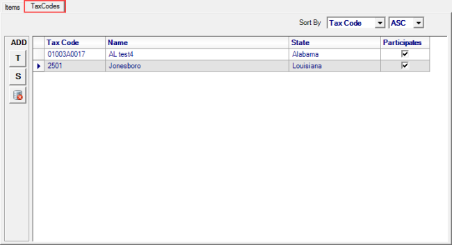 Add all Tax Codes for a State by clicking the button for State Tax Codes. All Tax Codes from the State will be listed. To remove an item, select it then click the Delete icon.