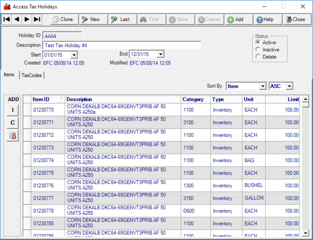 Use Createdand Modified to view the Username, Date and Time the Tax Holiday was created or edited.
