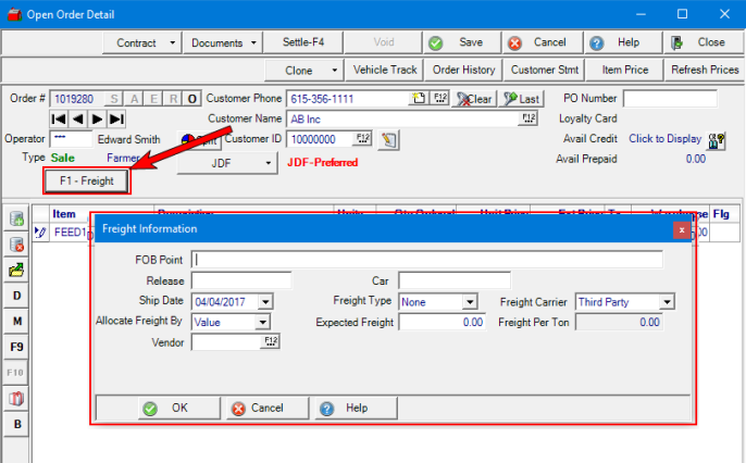 Add Third Party Freight by clicking the new F1-Freight button now available within the Order to open the Freight Information window. Orders created by cloning a Closed Order do not include any Third Party Freight entered on the original order.