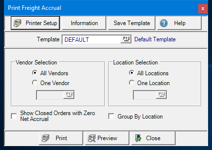 All Vendors are selected by default. Focus the report on one Freight Vendor by entering the Vendor ID or use F12 to search.