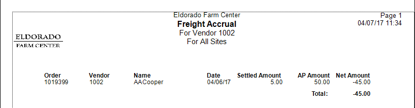 Select Show Closed Orders with Zero Net Accrual limits the report to Orders where the Settled Freight entered as Expected Freight on the Order, and AP Freight amount, are equal.