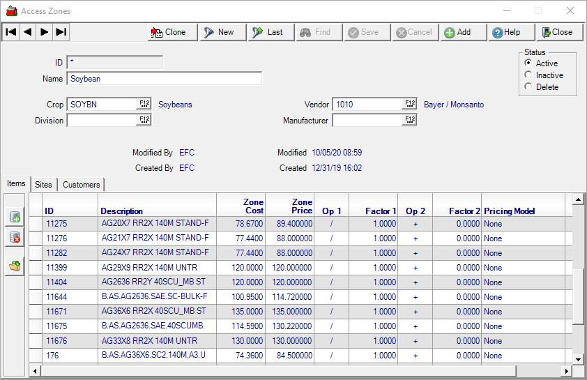 Pricing Zones reflect the zones Bayer use to determine prices and availability for seed items and apply when a Grower Planning is set to Price at Sale. The price set by Bayer will display as the Zone Price.