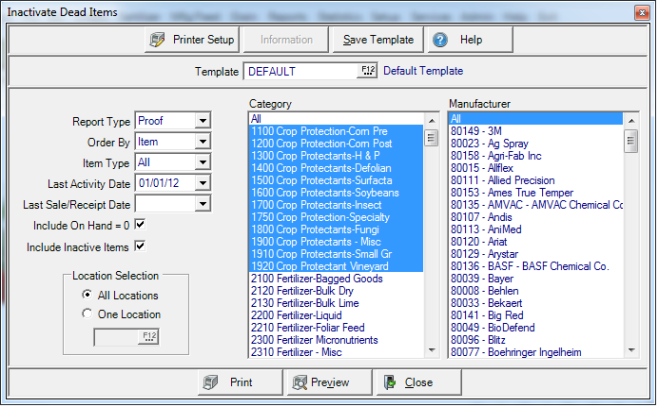Make prior season seed items inactive by using Inactivate Dead Items found in Inventory > Item Maintenance or manually change Item Status in Item Detail to Inactive. When using Inactive Dead Items, be aware that all items listed on the Proof report will be marked Inactive. Setting seed items from prior seasons to Inactivate ensures errors are avoided when using the Post function in a Grower Planning.