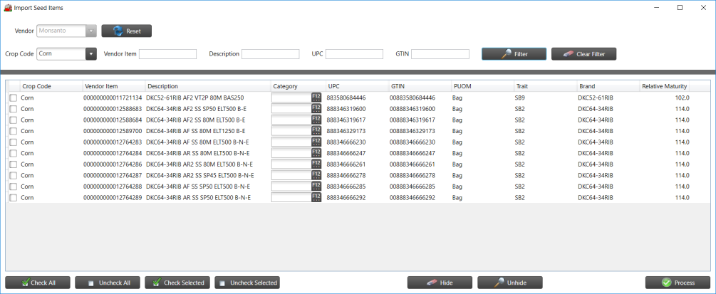 Use the Crop Code drop down list to filter the grid by crop. These Crop Codes correspond with the Crop Codes referenced in Vendor setup.