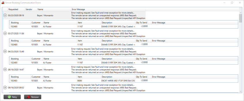 Use Booking Communication Errors to view transmission errors, most commonly a past season item has been ordered, an issue with the Unit of Measure, or a connection issue. Use the Booking Communication grid to manually re-submit after any error has been corrected.