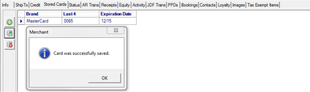 When a Credit Card has been successfully added to a Customer Account, the following confirmation message appears.