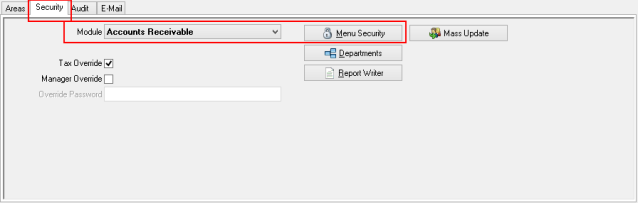 Select a User then select the Security tab, in the Module field select Accounts Receivable, and click the Menu Security button.