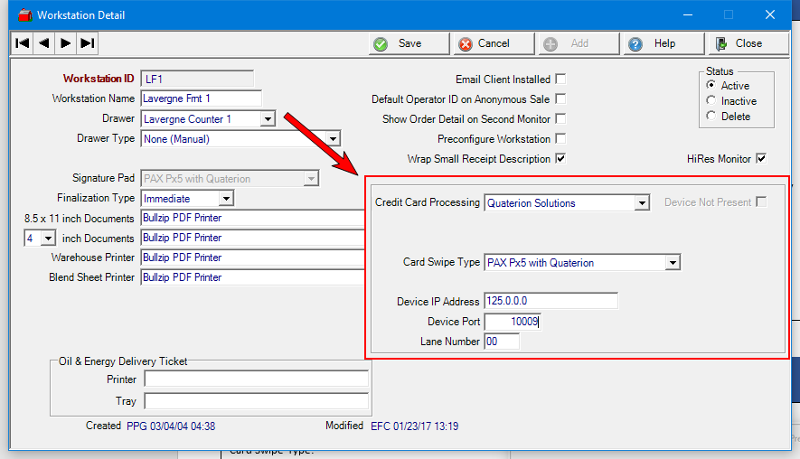 When users will be adding Stored Cards to Customer accounts, the Workstation utilized must be set up for an Equinox pin pad. Verify the Workstations settings by navigating to Merchant Ag PM > Setup > Access Workstation and select the Workstation.