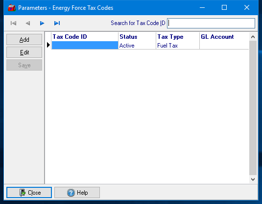 Use the Tax Codes button to create Tax Codes that will be ignored by Merchant Ag when the Energy Force import occurs. Click Add and entering a Tax Code ID of up to 20 alpha-numeric characters. Use the drop down menu in Status to select Active or Inactive.