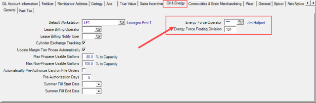 Select the Oil & Energy > General tab and enter the Energy Force Operator which will appear in the Order Comment section of an Order and Energy Force Posting Division.