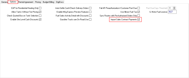 To allow payments to be settled to a customer prepaid, select the parameter Import Sales Contract Payments found on the Options tab of the PF parameter.