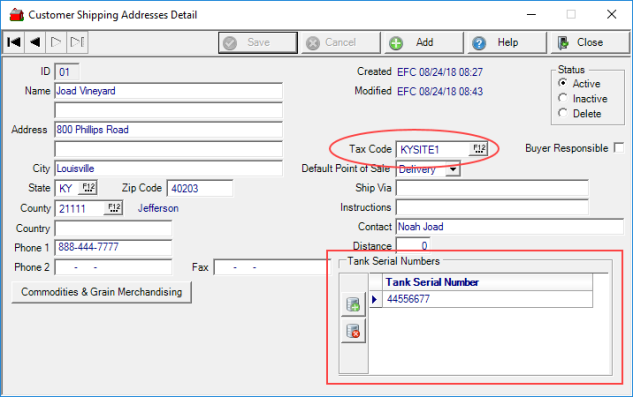 As transactions are imported, customers with multiple locations can verify that proper tax is assessed by including a Tank serial number and Tax Code on the Ship To address. If no serial number is present, the sale is made to the 00 billing address.