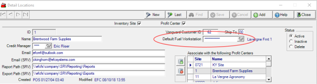 In Merchant Ag PM navigate to Setup > Access Locations to define the Default Fuel Workstation by entering the Workstation ID or using F12 to search. This information is encrypted when Save is selected.