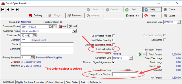 Energy Force transactions can be settled using a Prepaid marked as For Fuel Sales by entering or having the Energy Force Sales Contract ID imported when the parameter Import Sales Contract Payments is selected. Sales will be applied to the Prepaid when the Energy Force Contract ID matches the Sales Contract ID in the daily import file. If no match, the sale is applied to the Customers Accounts Receivable account.
