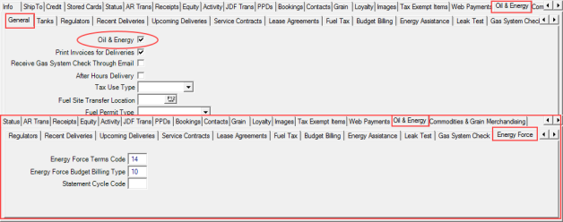 Set Customers first as an Oil & Energy customer by navigating to AR > Access Customers > Oil & Energy > General then flag as an Energy Force Customers by accessing the Energy Force tab and set the Energy Force Terms Code, Energy Force Budget Billing Type and any Statement Cycle Code.