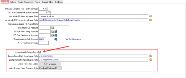 Select the checkbox and supply the paths for the Energy Force Daily Clear Import, the daily sales file and Energy Force Customer Export which contains customer information.