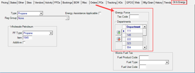 Access the Items to be referenced in the Energy Force import file and navigate to the Oil & Energy tab. In the Energy Force section, enter the Tax Code that will be referenced during the import and included in transactional information. The import file contains the amount of tax assessed for transactions.