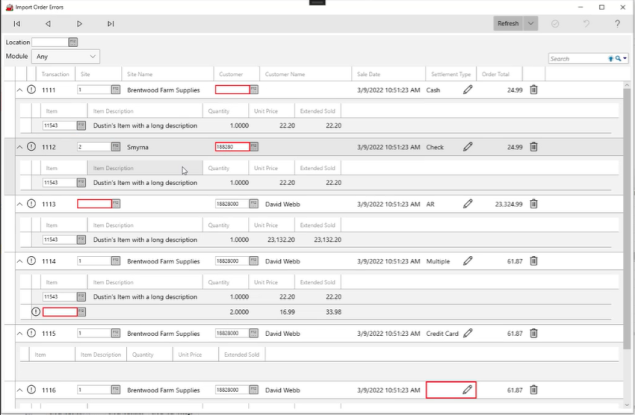Select the Location ID and filter by Module by using the drop down list. Correct the issue that caused the transaction to fail during import identified by the fields highlighted in red and click Process.