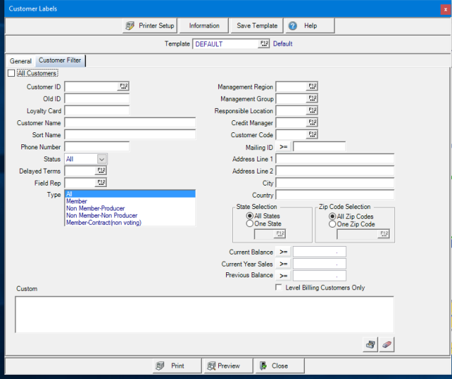 The default selection in the Customer Filter is All Customers. Remove the checkmark to access the additional fields create a filter.