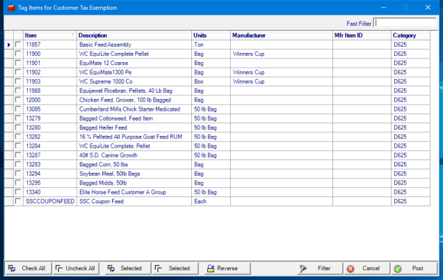 The Tag Items screen appears with items listed based on the filter selected. Be aware that the Tag Items window title confirms which function you are tagging items. In the example below, Items are being tagged for Customer Tax Exemption.
